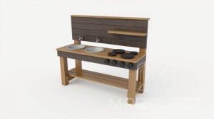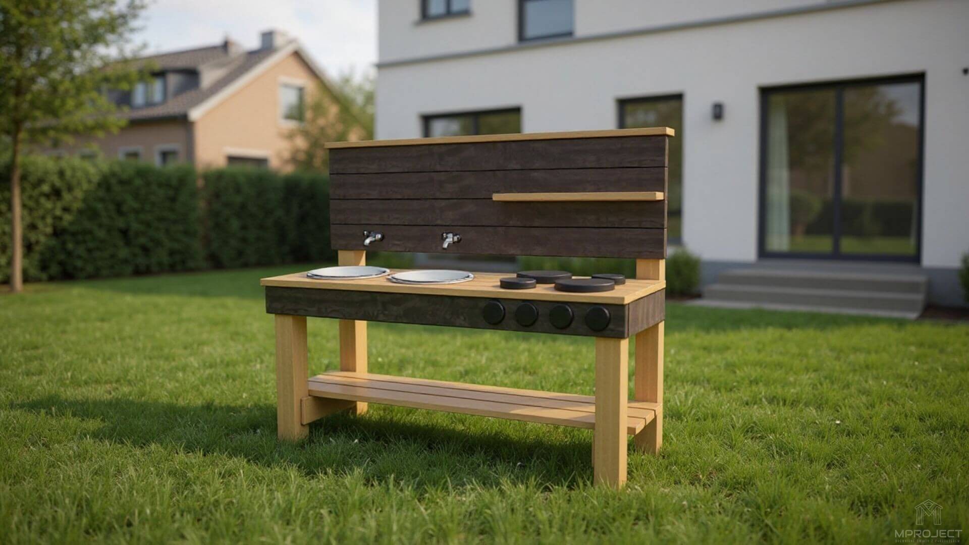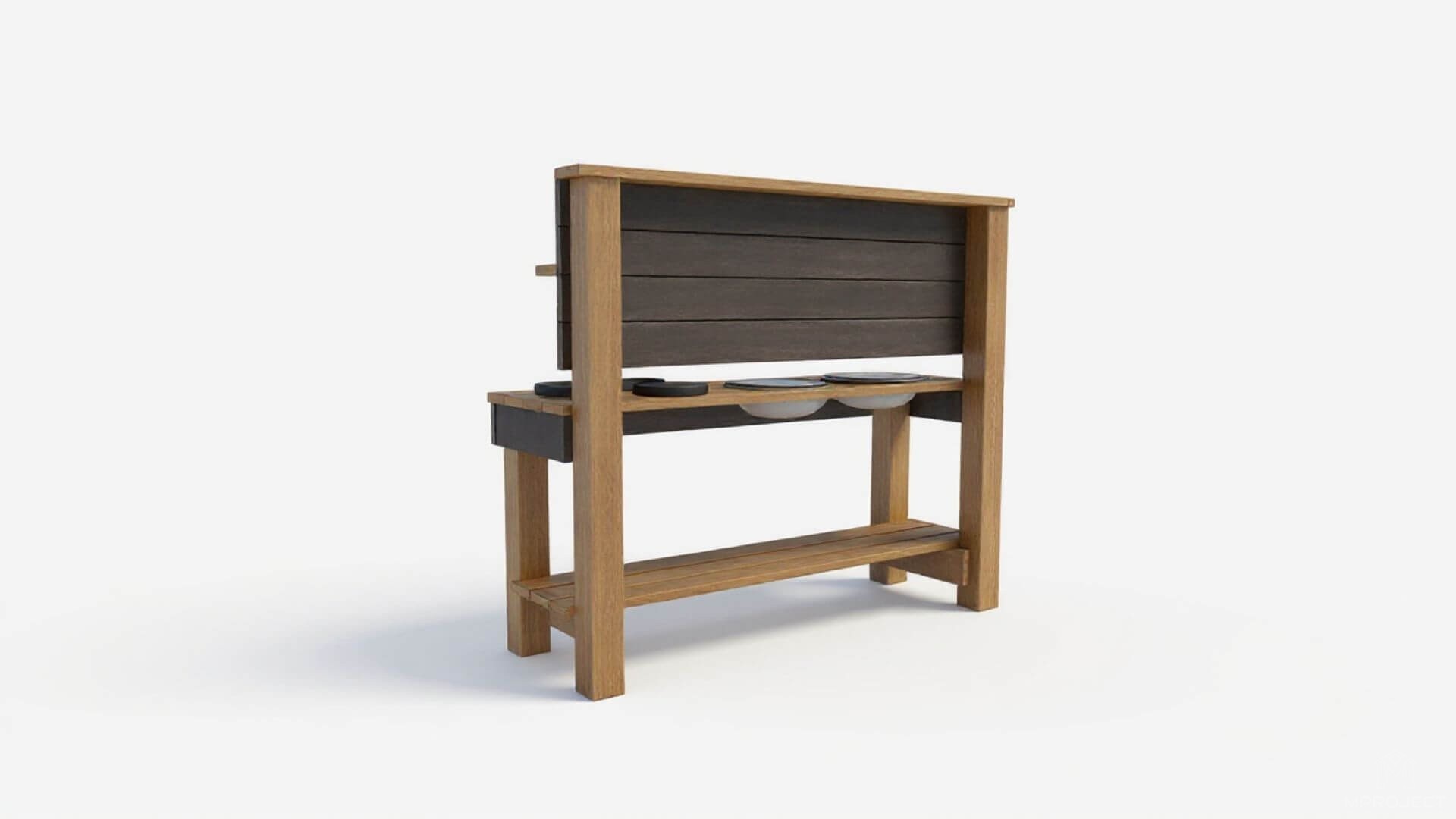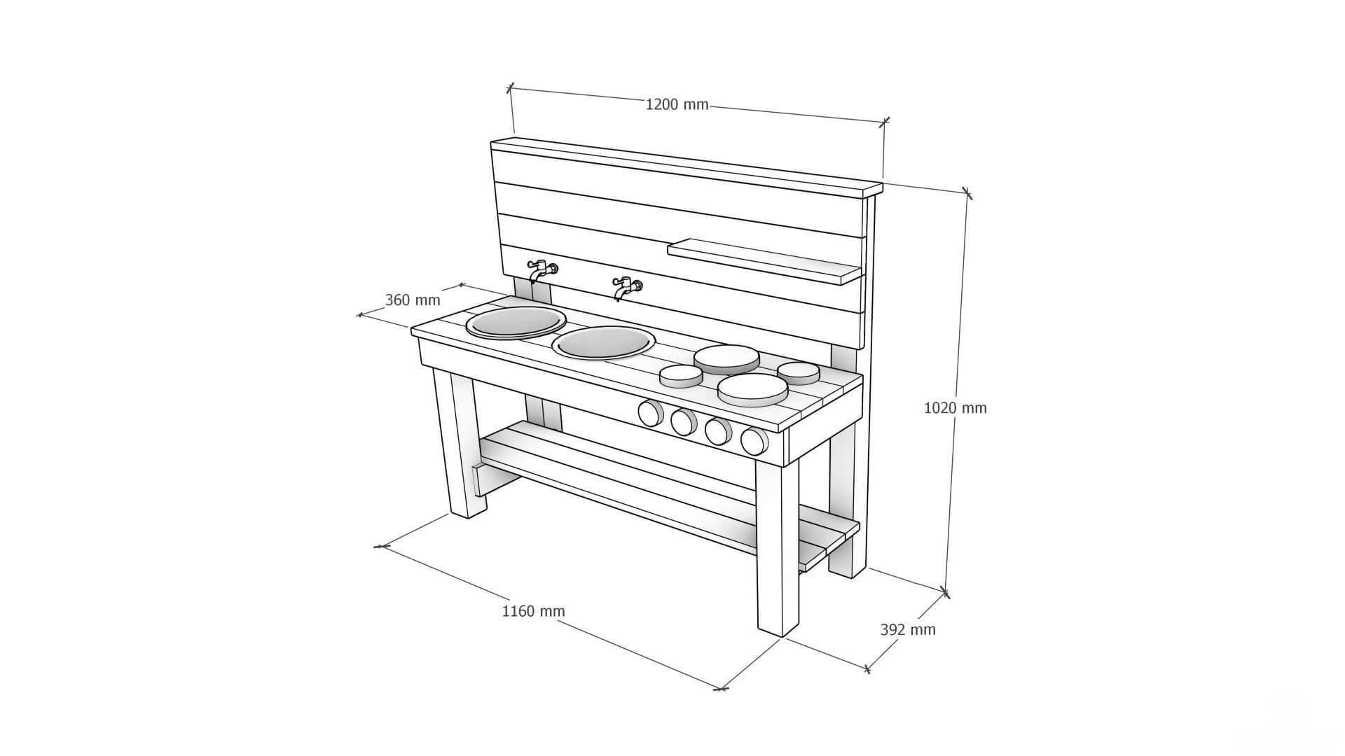 Kreatív, kerti játékkonyha gyerekeknek. Két fém mosogatóval, vízcsapokkal, égőkkel és tekerőgombokkal felszerelve – fejleszti az érzékszerveket, a képzelőerőt és a finommotorikát. Ideális szabadtéri érzékszervi játékhoz. Stabil, tartós és esztétikus – biztonságos játékra tervezve.