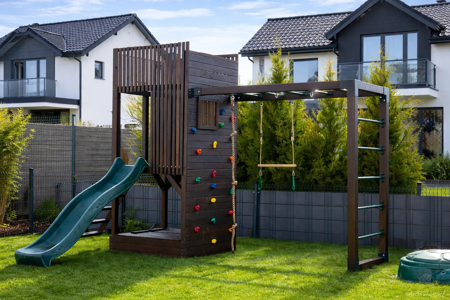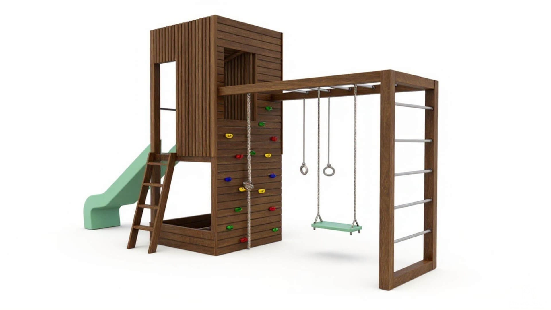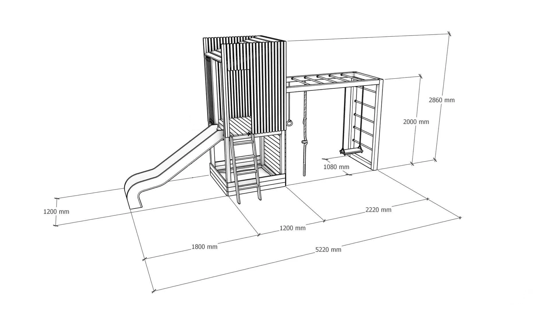 A formatervezett kialakítás csúszdát, hintát, mászórudakat és homokozót kombinál, így egy egységes és izgalmas játéktér jön létre. Ideális választás modern kertekbe.