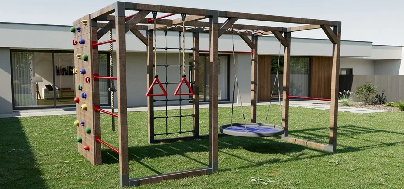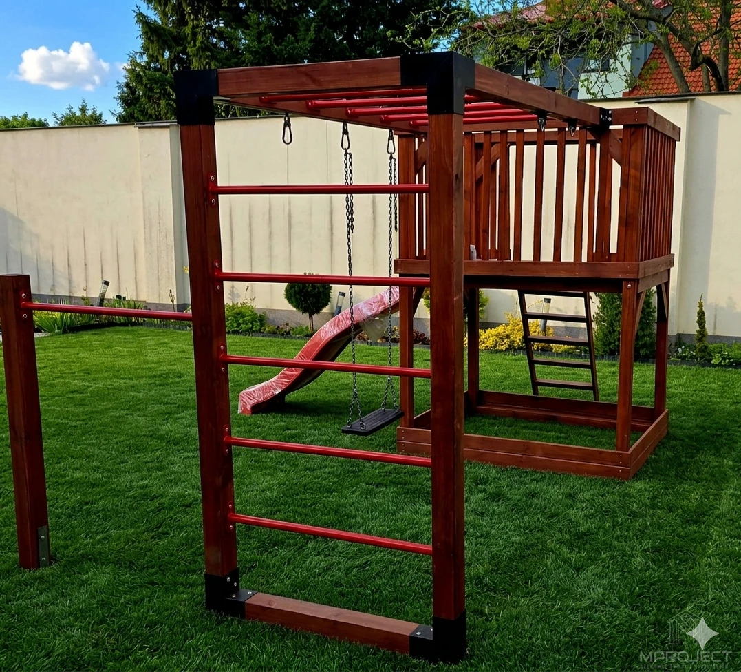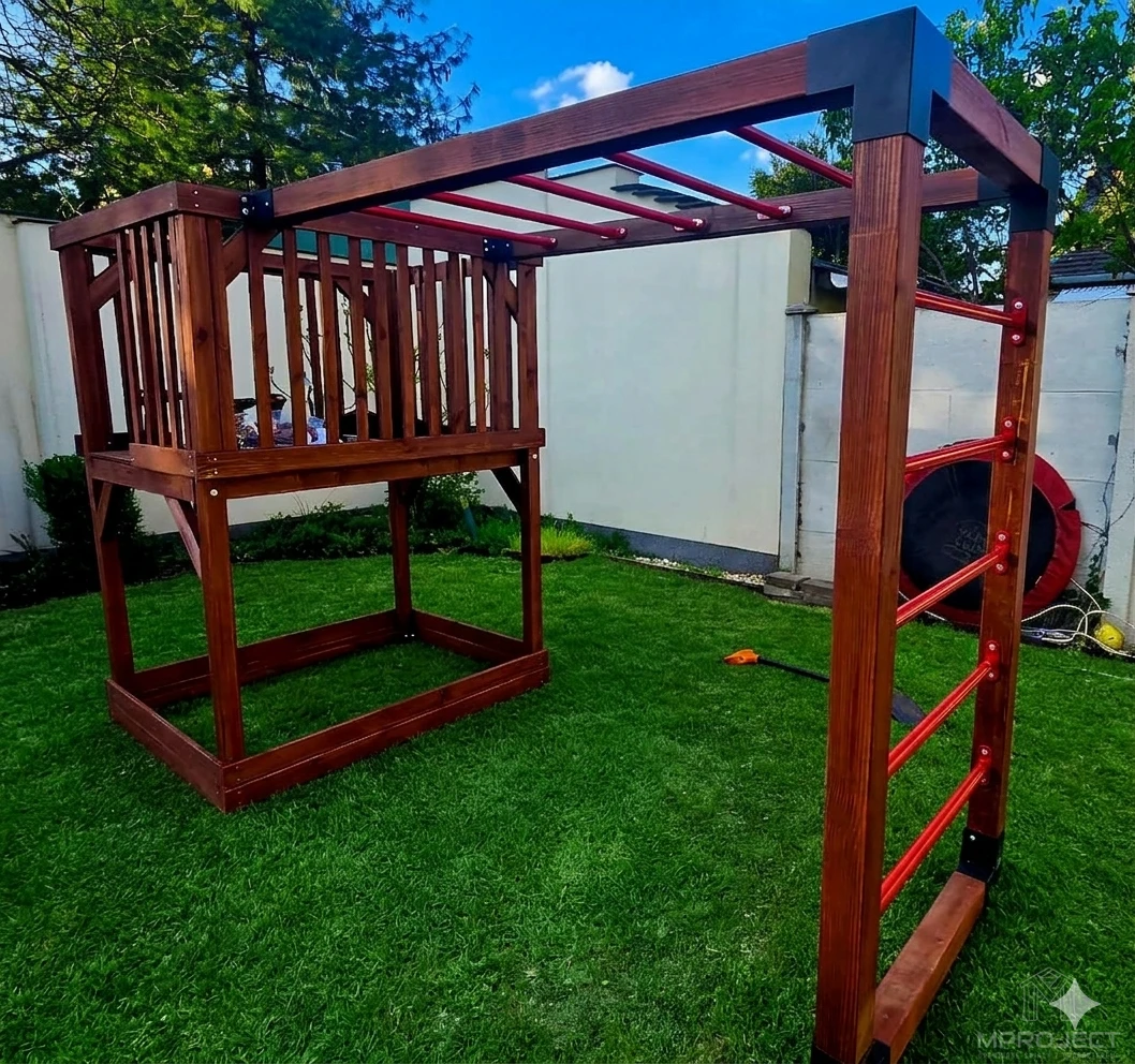 Ez a funkcionális és esztétikus, kiváló minőségű fából készült játszótér ideális választás azoknak a családoknak, akik biztonságos és kreatív játéktérre vágynak a kertben. A szett tartalmaz: csúszdát, homokozót, mászólétrát, hintát, tornagyűrűket és mászófalat. Stabil kialakítása és időjárásállósága garantálja a hosszú élettartamot.