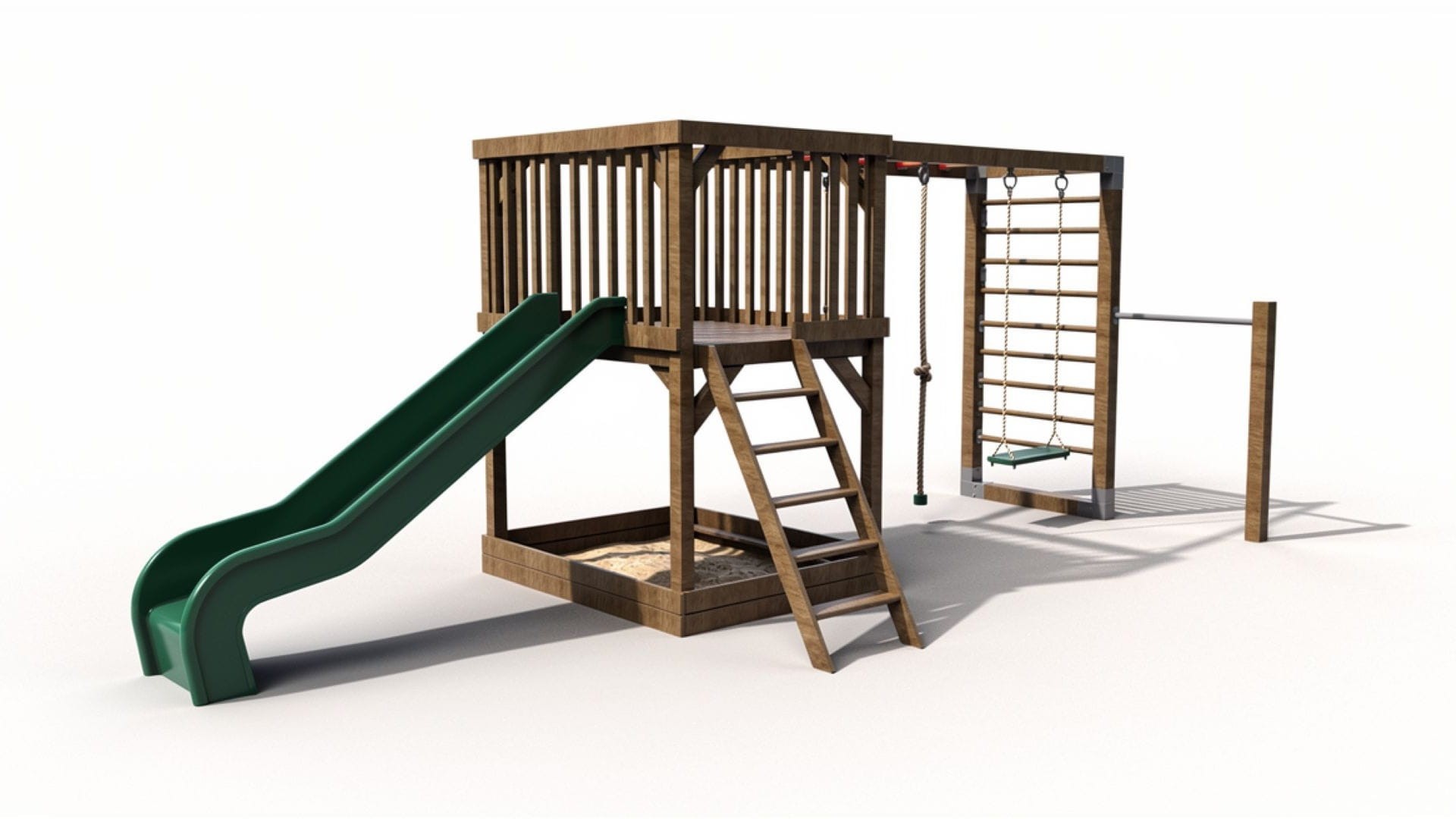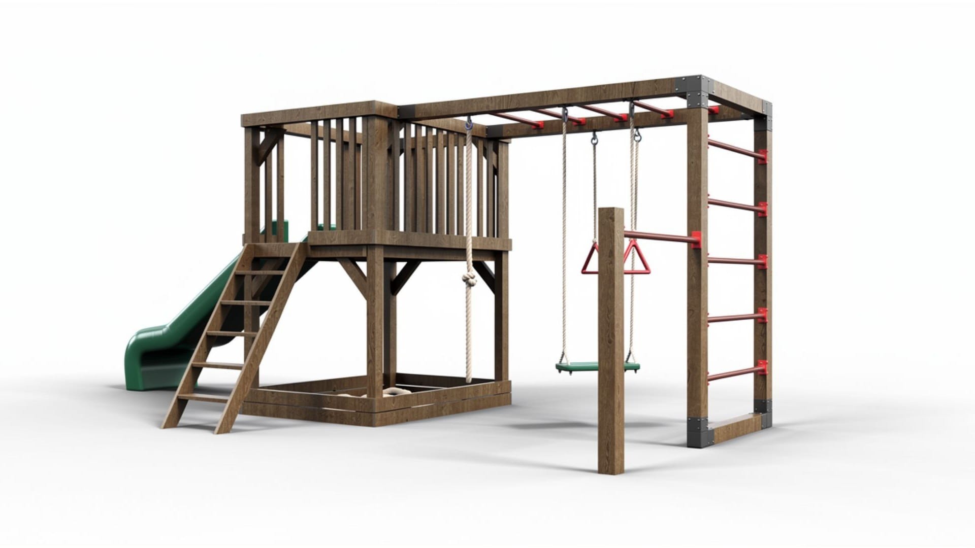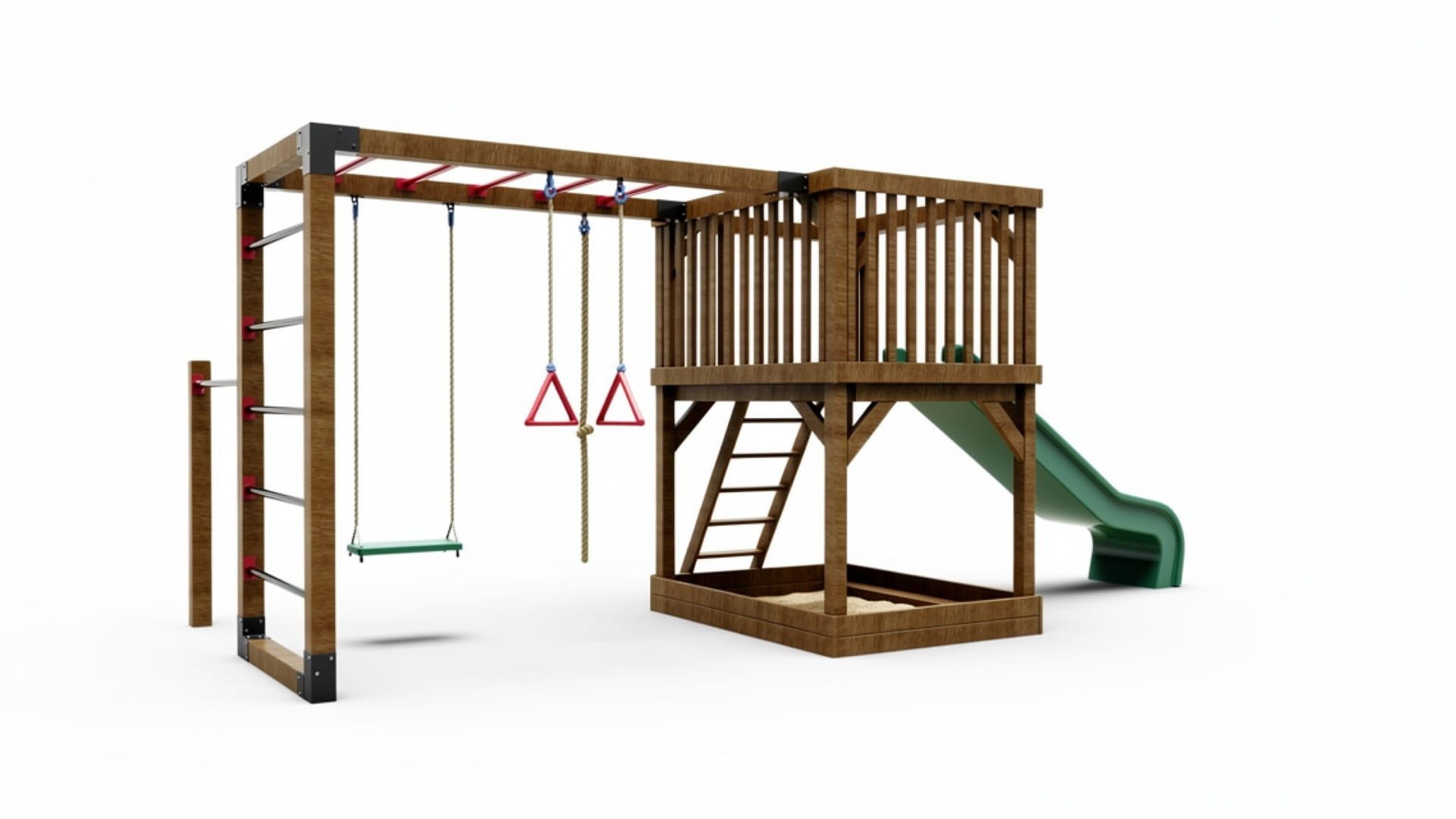 Fa játszótér hintával, csúszdával, homokozóval és mászólétrával a kertbe.