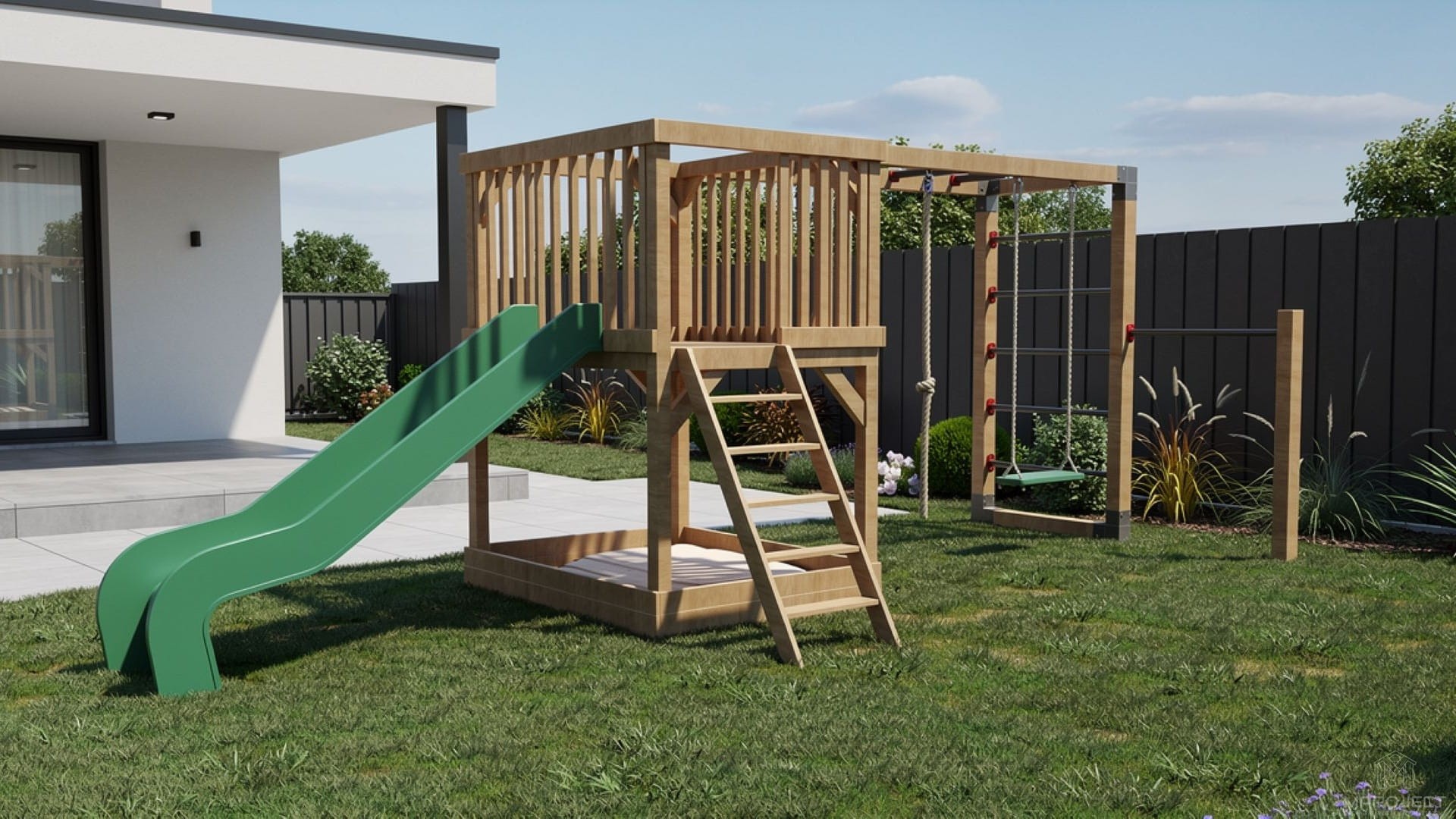Játszótér terasszal – csúszdával, hintával és homokozóval. Tartós kerti játékszett gyerekeknek.