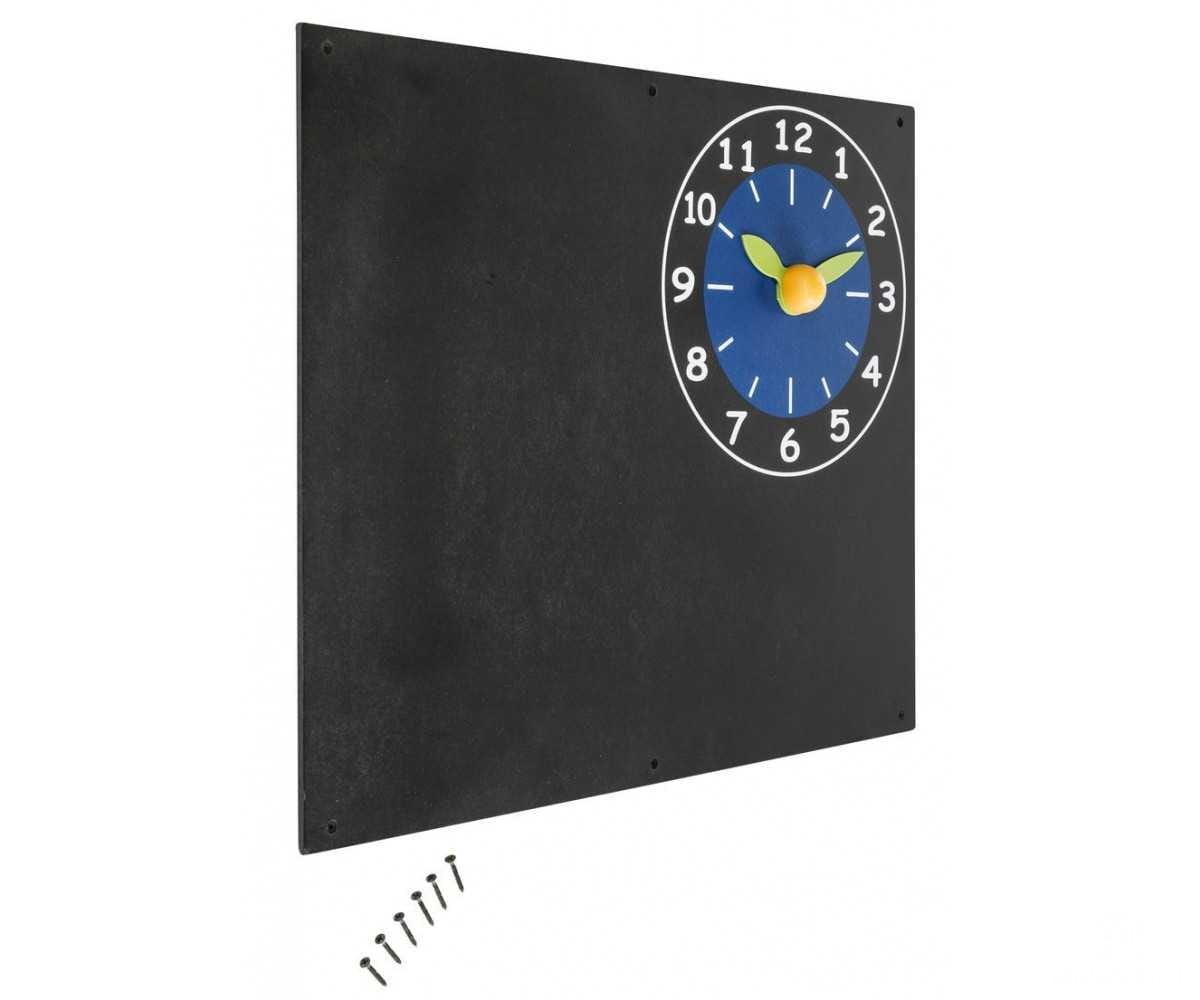 Kültéri használatra alkalmas krétatábla. Kézzel beállított mutatókkal ellátott órával is fel van szerelve.