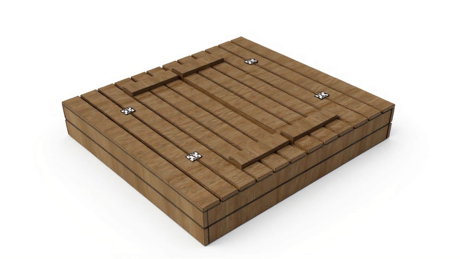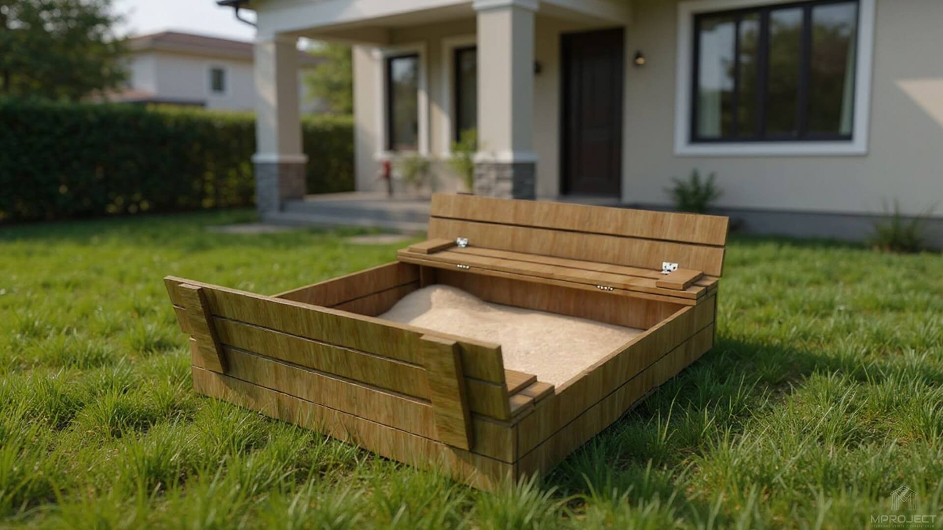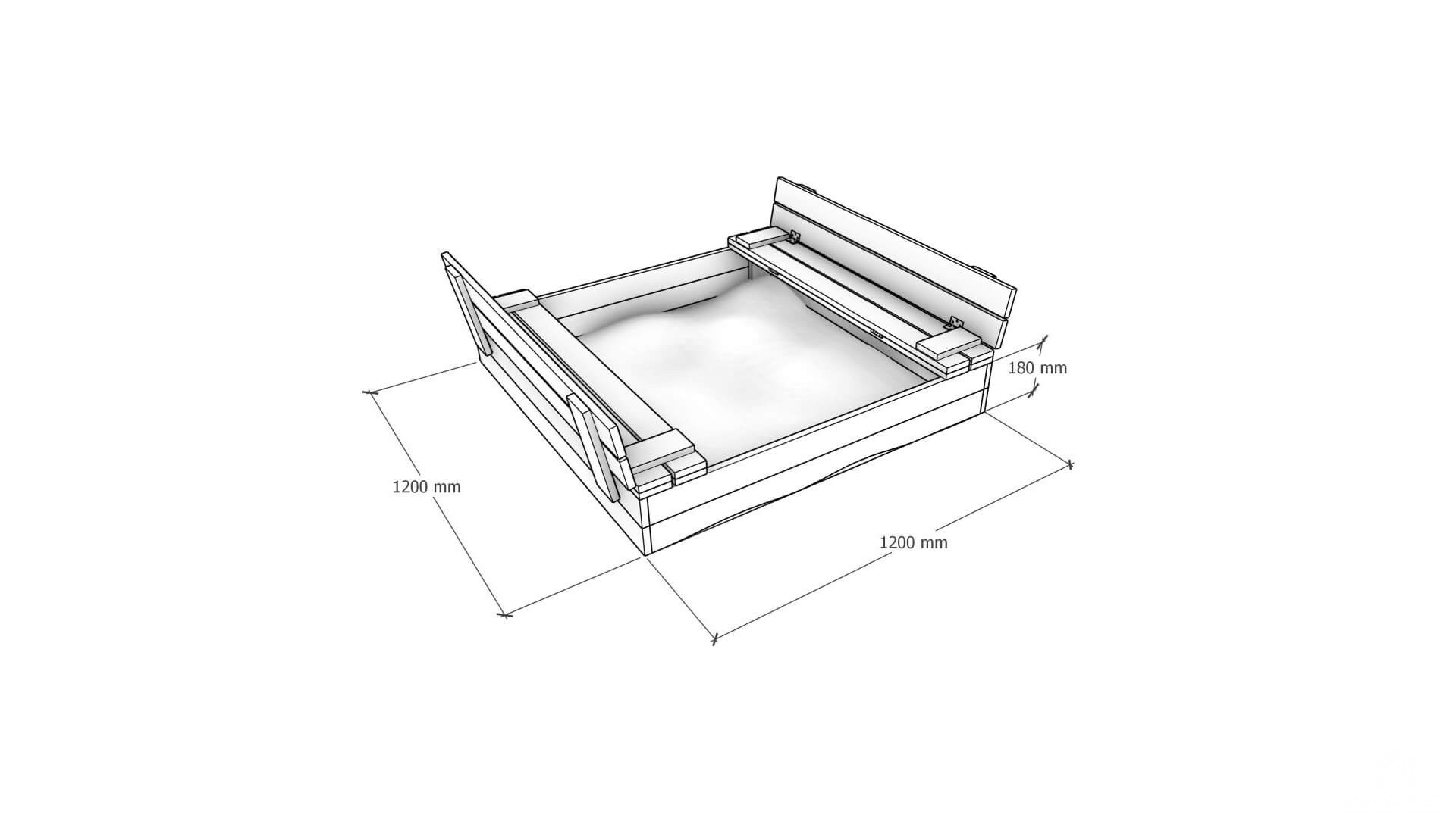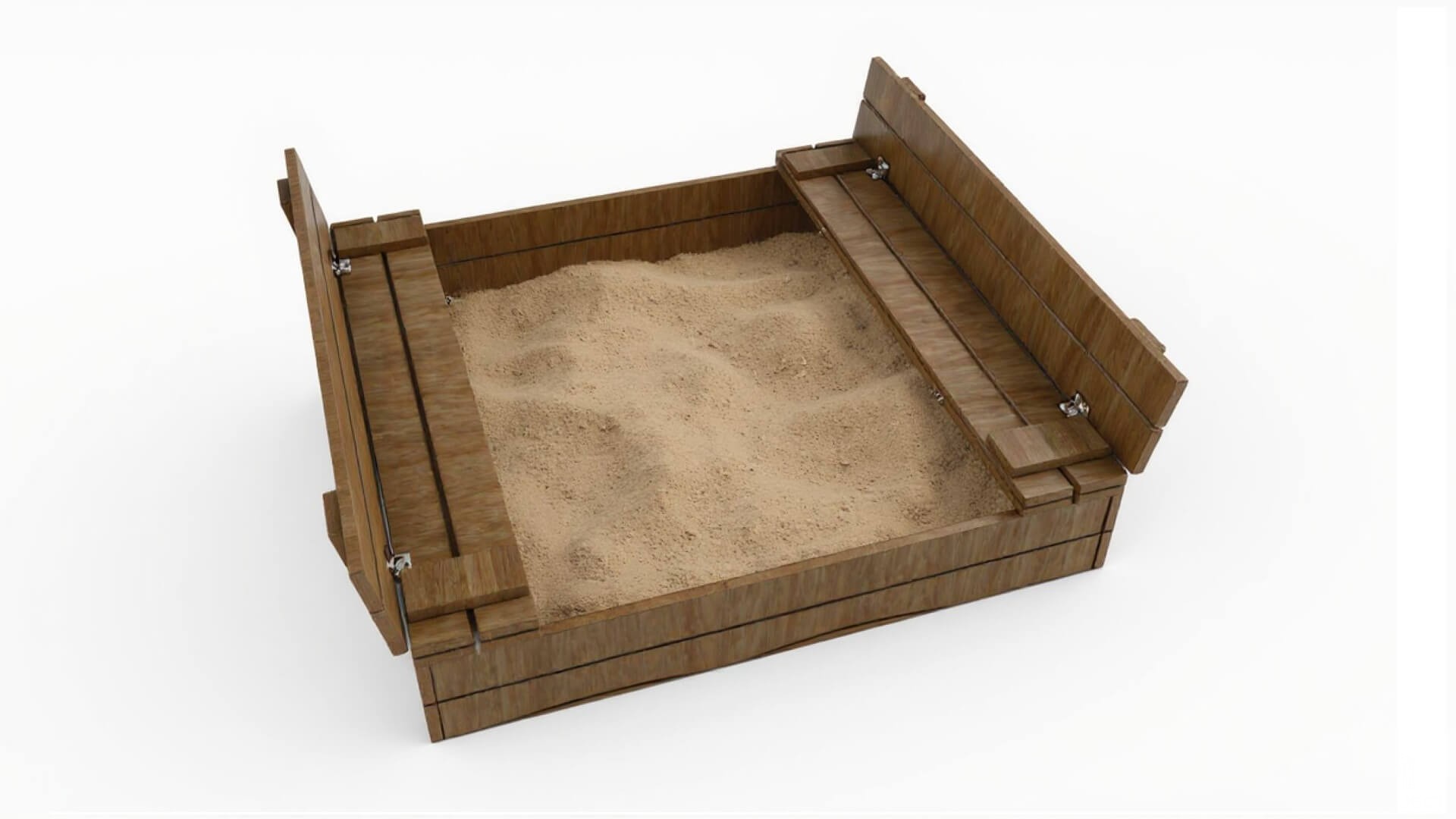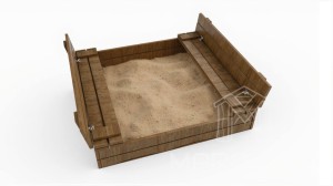 Praktikus, fából készült homokozó felhajtható fedéllel, amely megvédi a homokot a szennyeződésektől.